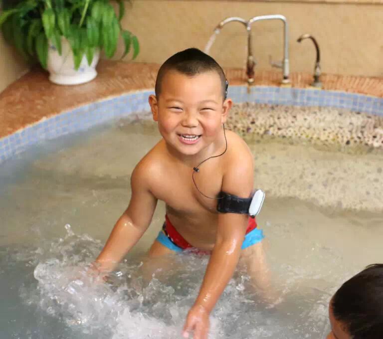 接下来的体验环节,在温泉泳池的AB小用户们在水里玩耍,在水池边嬉闹,兴致高涨,气氛很带动人。家长们也在一旁忙得不亦乐乎,感叹科技的进步不断给耳蜗孩子带来福音。